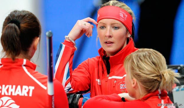 Britain's Jackie Lockhart, Eve Muirhead and Kelly Wood do slightly more idling during this strategy powwow than they do during actual play.