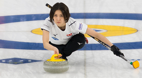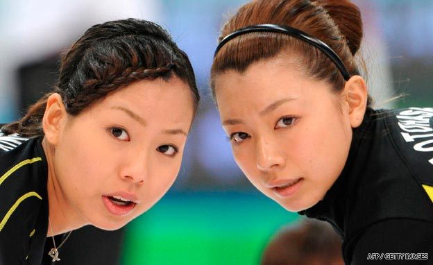 Japan's Anna Ohmiya (left) and Mari Motohashi (right) hurry hard versus Switzerland in early round robin "action."